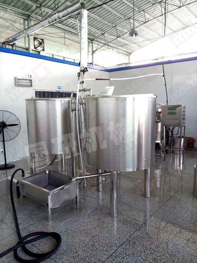 加工豆腐有六道工序:清洗浸泡(夏天4个小时,冬天6个小时,目的是更大限度的确保出浆率)—磨浆分离(传统工艺需要人工筛浆,而机器是采用浆渣自动分离,减轻了人力,极大提高生产效率)—高温煮浆(豆浆自动流入煮浆桶,通过蒸汽加热煮熟)—点浆(豆浆煮开后,再加入凝固剂成型)—压榨(挤出水份)—成品豆腐。
