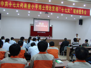 2007年11月14日下午3时,中共十七大代表唐小平博士前来我司宣讲十七大精神,活动在广州市开云网页版登录入口设备制造有限公司大会议厅举行,参加大会的有广州市天河区组织部、宣传部领导、珠吉街道党工委的领导同志们以及我司全体员工,广东电视台、广州日报等多家媒体派记者前来报道。大会由国研副总经理、党支部书记王声跃主持, 国研董事长、总经理王声位作了热情洋溢的讲话,介绍了开云网页版登录入口的发展规划以及党支部的建设情况。