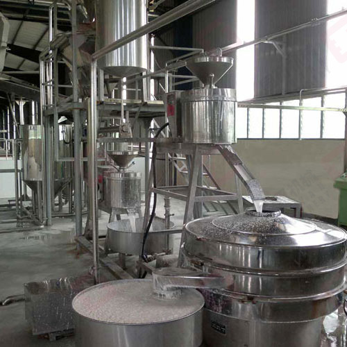 大米→射流提升→除砂→洗米、浸米→沥水→定量输送→破碎→旋风分离→出料→加水及辅料混和→提升→储料→自动定量喂料→自熟→挤丝→自动切断、上挂→连续吊挂老化→蒸粉→二次吊挂老化→松丝→连续吊挂干燥→自动切断→成品