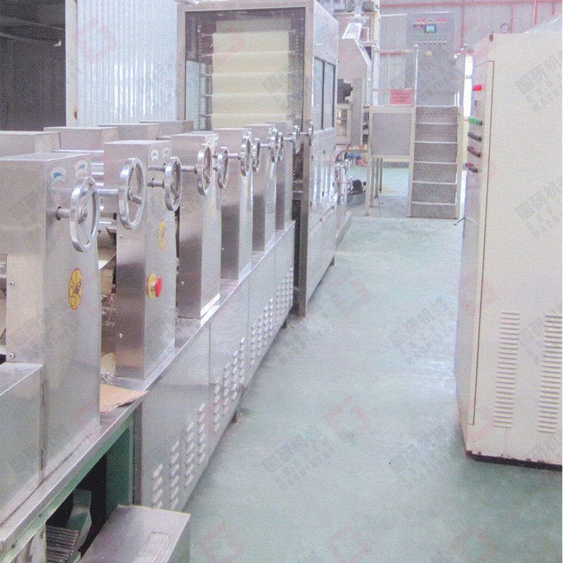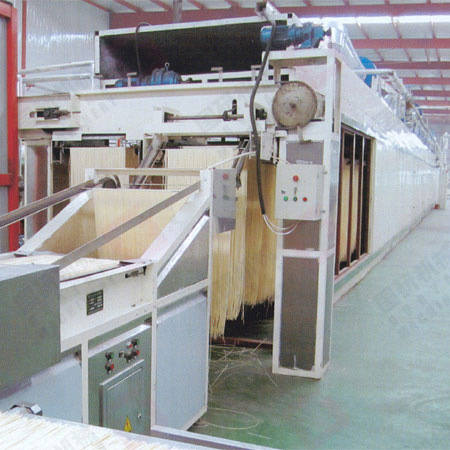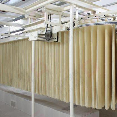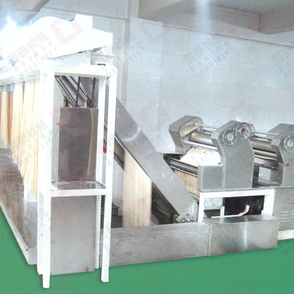 熟化机、压延机、连续压片机、切条机、给杆挂条机,五部分连为一组,完成面条的成型阶段。搅拌和好的松散面粉经~10分种熟化,使面粉充分吸水、嘭化形成湿面筋网络,送入复合机同时制成两片面片,合压成一片,然后经六至七对辊压延,以不破坏面筋组织的压延比压制出厚0.8~2毫米的面片。压好的面片经过切面刀,按不同规格切成0.8~6毫米的湿面条。由自动给杆机把切成2400-2600毫米长的面条经挂条机送到平行链架,采用光电或接近关电器控制,同步地挂在烘干装置的吊架上。尾端剪齐机装在预干的出发点上。